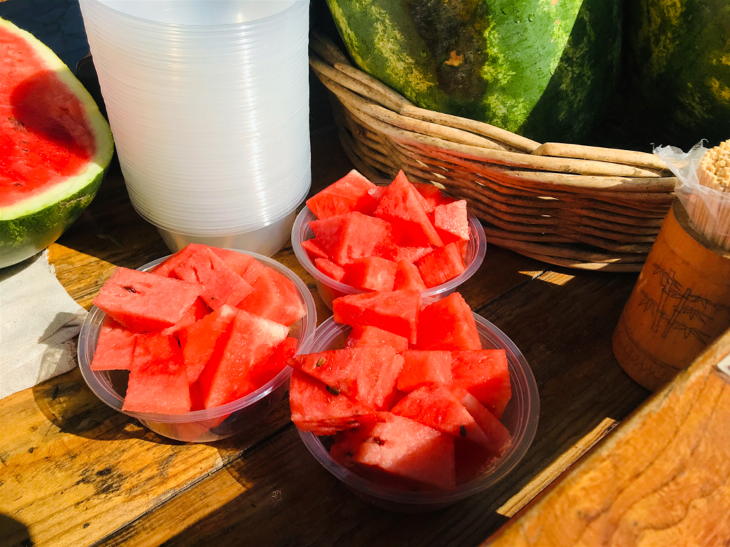 這家生意很好,瓜都是現(xiàn)切現(xiàn)賣(mài)的,保證讓大家吃得新鮮。