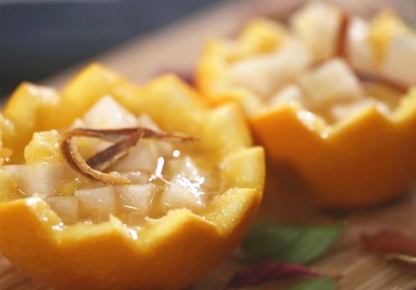 《山家清供》中記載:“雪梨大者,去皮核,切如骰子大。后用大黃熟香橙,去核,搗爛,加鹽少許,同醋、醬拌勻,可佐酒興。”即選用大個雪梨削皮去核,切成骰子大小。然后用色澤黃亮成熟的香橙,去核搗爛,加一點鹽,和醋、醬油一起拌勻。雪梨甘甜,香橙多汁,二者同食不僅味道清爽,還兼有醒酒的功效。