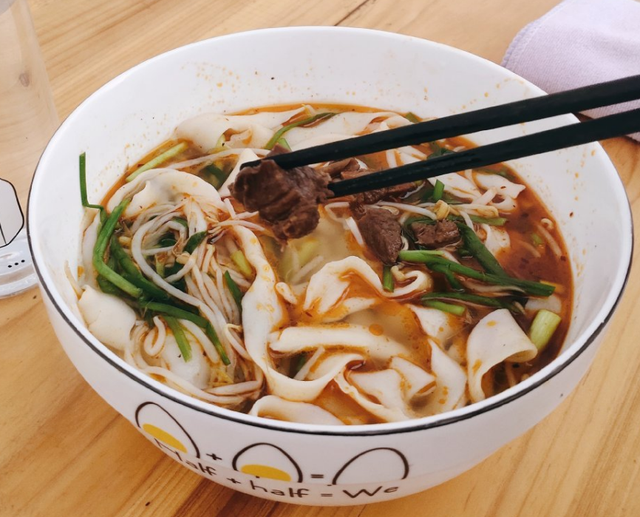 熗鍋燴面特指河南省南陽(yáng)熗鍋燴面,記得小編我第一次來(lái)吃熗鍋燴面還是5年前,吃面四步驟:聞香、品湯、嘗面、放辣椒油——面滑、湯鮮、菜青、辣椒油香。燴面上桌后先喝口湯,湯鮮味濃,真的好鮮香,再加上兩勺羊油辣,喝完湯接著吃燴面,燴面滑爽勁道,面潤(rùn)軟滑,可謂是滿足!