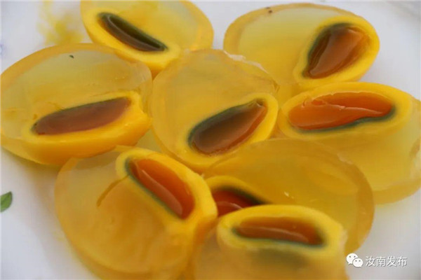 變蛋去殼后,蛋體如琥珀般晶瑩剔透,有雪花斑點(diǎn),蛋黃口感滑嫩香糯,風(fēng)味獨(dú)特,筋道有彈性,又便于攜帶和保存。在汝南提起變蛋,幾乎家喻戶曉。