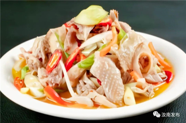 汝南縣名吃椒麻雞,采用煮、泡、吹、撕等工藝精工制作,取雞脯、雞背、雞腿三個(gè)部位的肉,加自制椒麻汁拌勻,吃起來無骨無渣,清香味十足,口感非常好。
