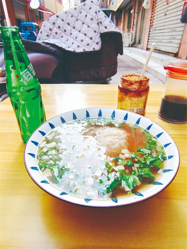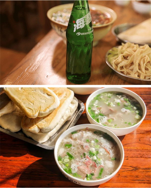 喝湯,還有固定搭配。湯+餅絲+海碧俗稱喝湯三件套,清爽解膩的汽水配上濃香十足的湯汁,再來一份餅絲泡在湯中,每一口才下舌尖,又上心間。