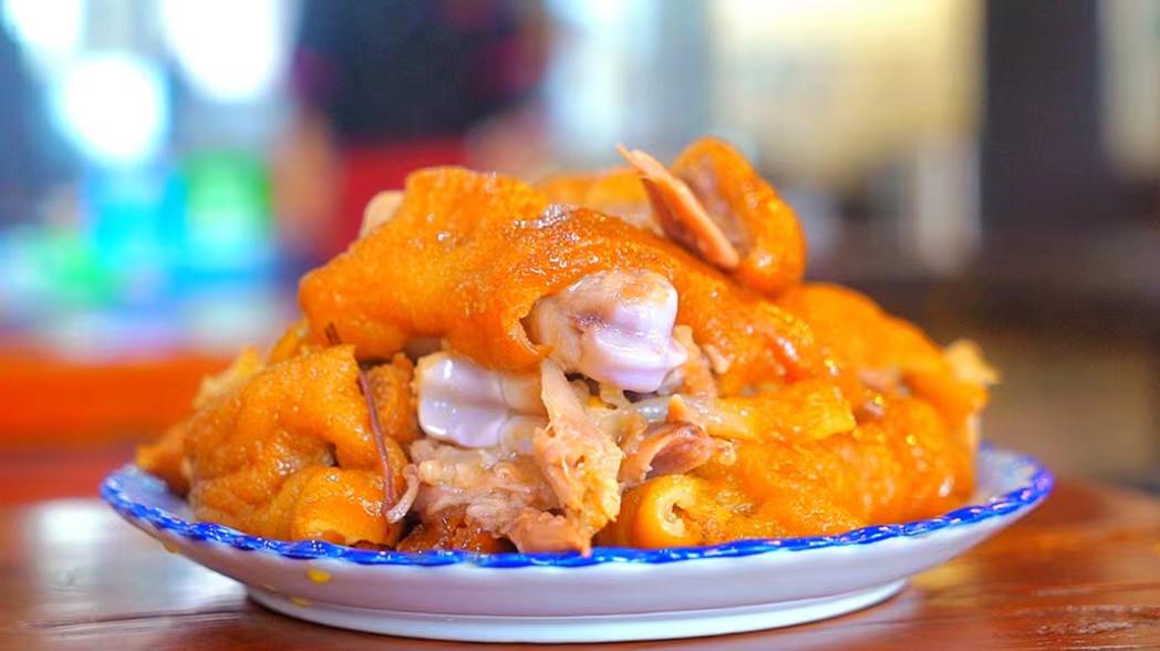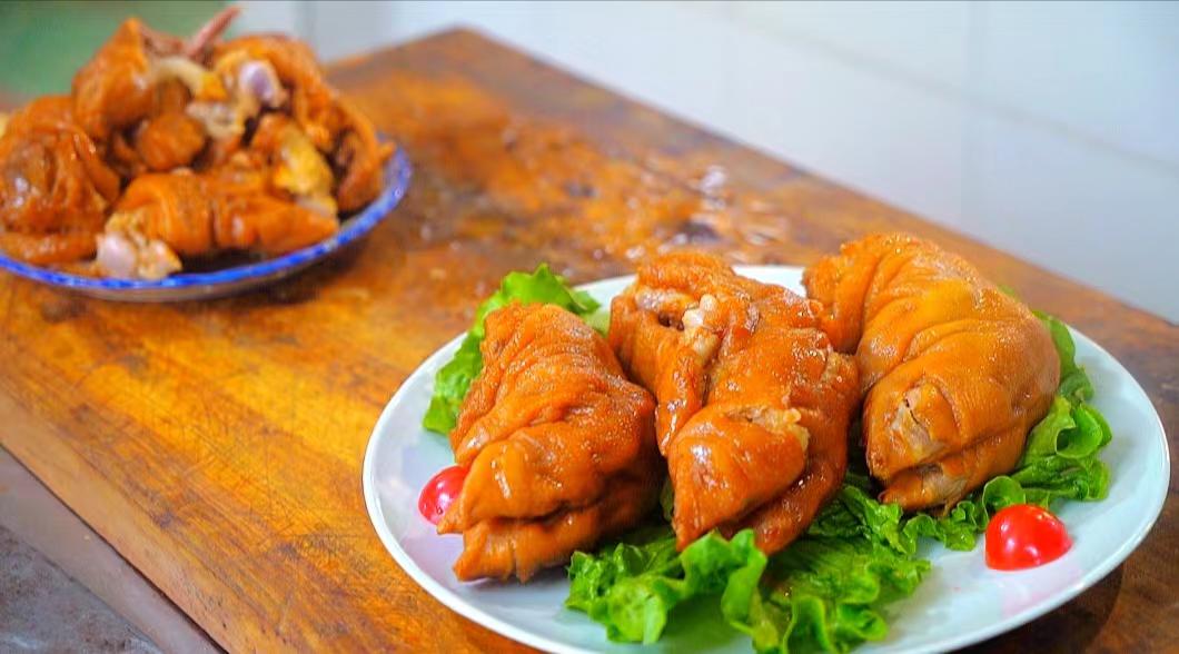 “王洛紅燒豬蹄精選優(yōu)質(zhì)鮮豬蹄,經(jīng)過刮洗,汆水預(yù)煮,抹蜂蜜,油炸上色,配料鹵制等多道工序鹵制而成,單是制作豬蹄的配料就有草果、肉蔻、大小茴香、良姜、白芷、花椒、辣椒等30多種。成品呈醬紅色,咸淡適中,爛而不散,肥而不膩,濃香可口。豬蹄內(nèi)含膠質(zhì),有一定的美容功效。同時(shí),王洛紅燒豬蹄以藥理配料,具有一定的健脾、健胃等功能。”石記鼎森豬蹄傳承店老板石景陽(yáng)告訴記者。