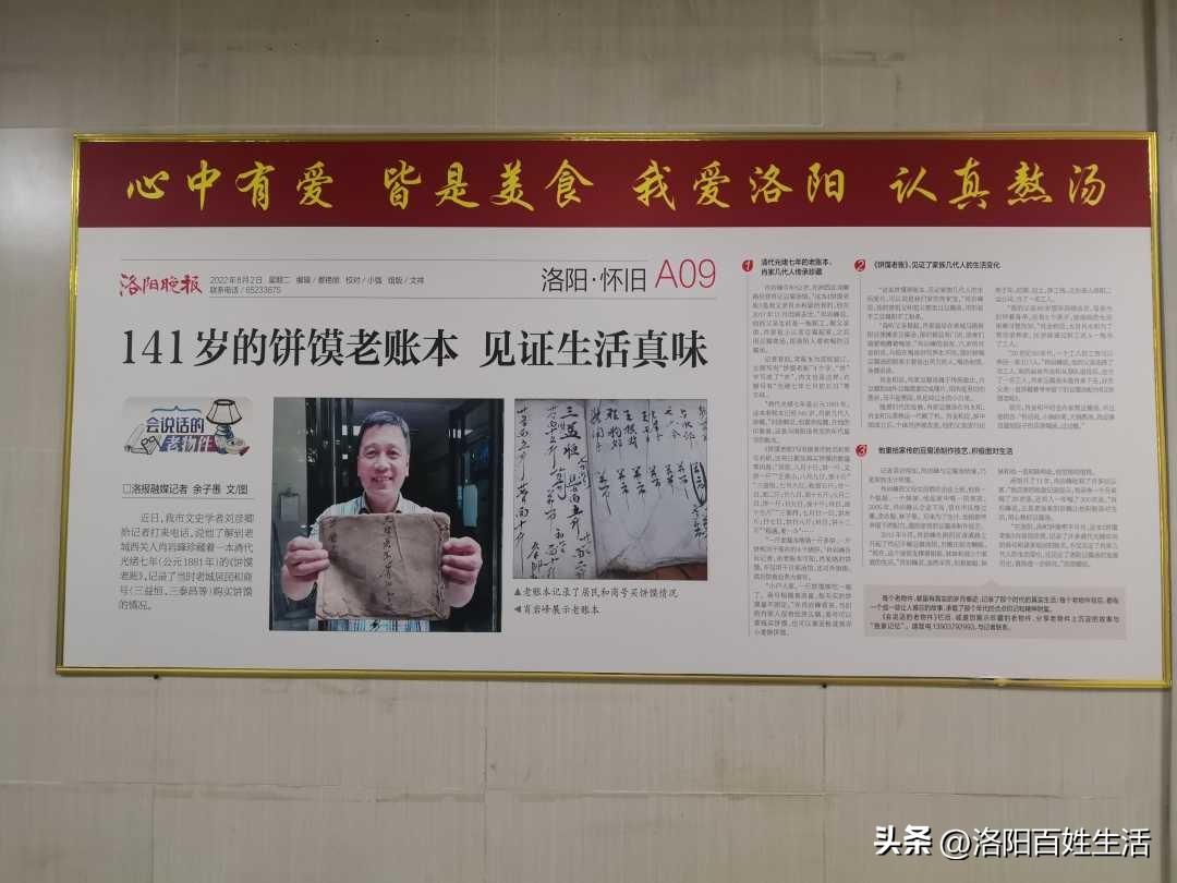 如此看來,漕米稅事件得到印證,但是否有5000人喝了肖記千碗豆腐湯,不得而知。不過,他家141歲的餅饃老賬本,肯定是真的,《》洛陽晚報(bào)》有專門采訪,湯館把它做成宣傳板,掛在墻上,氣派醒目,很有說服力。
