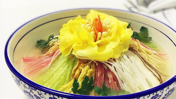 洛陽牡丹甲天下,做菜自然也不能放過牡丹。這道牡丹燕菜是洛陽水席中的一道菜,做成后湯盆中漂浮著一朵牡丹花,特別好看。