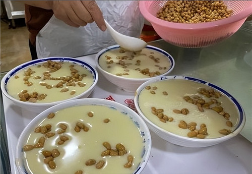 剛剛出鍋熱乎乎的媽糊,色白如乳,細膩無渣,喝到嘴中,滑潤如脂,香甜爽口,在上邊再撒上一把腌制好的黃豆,吃著別提多愜意了,喝完碗干凈如洗。