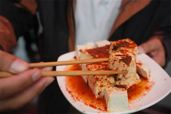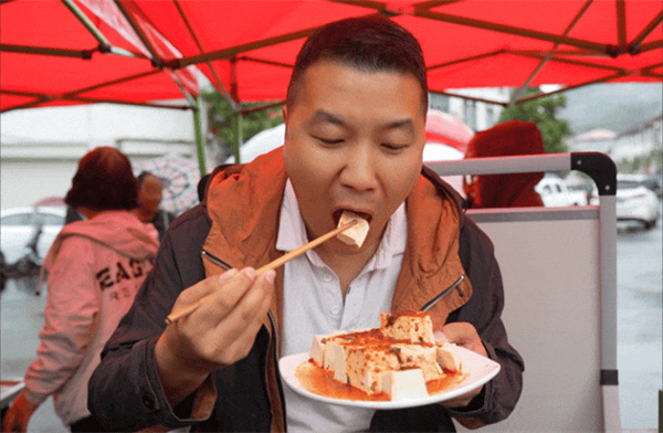 “賣豆腐啦~”剛到三川鎮(zhèn)街頭,就可以聽見一聲聲的叫賣聲。大老遠看見一堆堆人群圍繞著一排排的豆腐攤位,旁邊或蹲著或站著,人手一盤熱氣騰騰的豆腐,正在往嘴里“炫”。