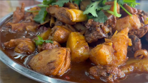 脫骨的雞肉配上軟綿的土豆,最后再加上大盤雞的靈魂伴侶“皮帶面”,好吃到停不下來。中牟縣融媒體中心供圖