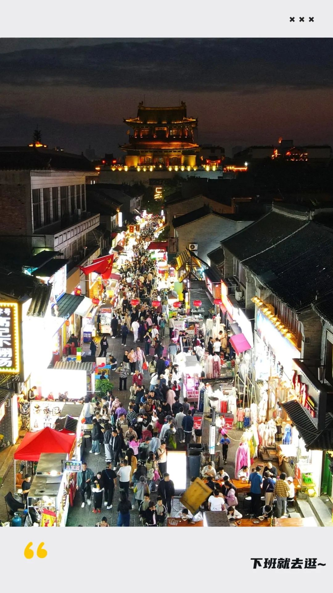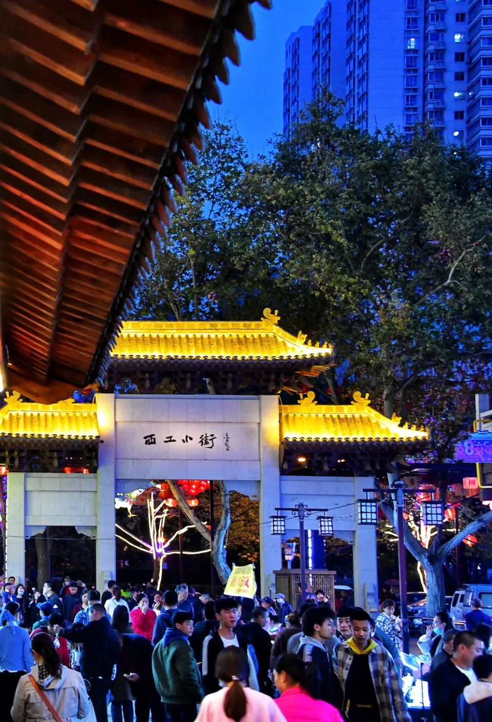 夕陽西下,夜幕降臨,十字街上場面頗為壯觀,寫著烤面筋/涮牛肚/炒涼粉/牡丹餅/古法酸梅湯等小吃名的長方形燈牌齊刷刷點亮,宛如一個大型菜市場。