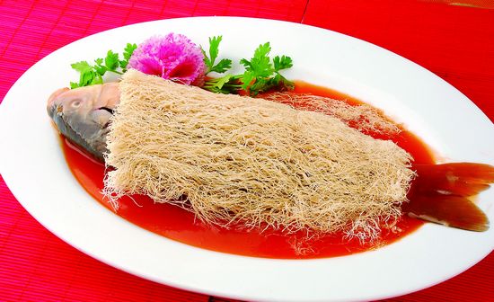 鯉魚焙面是開封傳統(tǒng)-名菜,由"糖醋熘魚"和"焙龍須面"兩道名菜配制而成。傳說,清代慈禧太后逃難時停留在開封,開封府名廚貢奉"糖醋熘魚"和"焙面"。慈禧見狀后,心血來潮說道,鯉魚靜躺盤中,大概是睡著了,應(yīng)該給它蓋上被子,免得受涼。隨之起筷將"焙面"覆蓋魚身,"鯉魚焙面"從此傳為佳肴了。其特點是色澤棗紅,軟嫩鮮香;焙面細如發(fā)絲,蓬松酥脆。