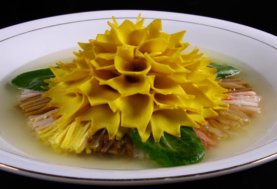 洛陽(yáng)燕菜又稱牡丹燕菜,屬河南菜、豫菜。主料有白蘿卜、海參、 魷魚、雞肉。成品洛陽(yáng)燕菜只見一朵潔白如玉、色澤奪目的牡丹花,浮于湯面之上,菜香花鮮,贏得貴賓們的拍手叫絕。