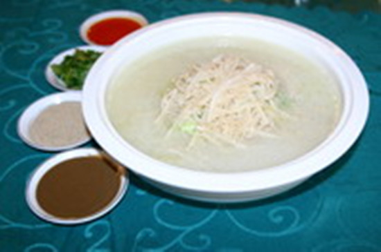 燴三袋亦稱“燴散丹”,為清真宴席中的上等湯菜。此菜選料嚴格,制作考究,風味獨特,深受食客青睞。用牛之熟制后的三袋、百葉、花肚切片、切塊,用白湯下鍋,武火餷制到湯汁濃白即成,上桌時外帶芝麻醬、辣椒油、香菜調(diào)味,是口感極醇厚之湯菜。