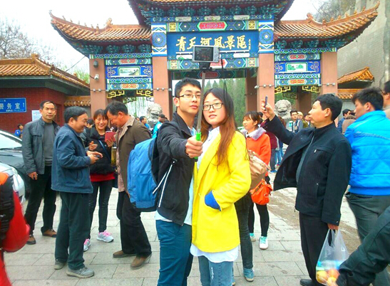 游客們?cè)诰皡^(qū)門口合影留念