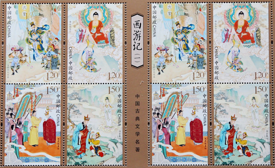 據(jù)了解,中國郵政推出的《中國古典文學(xué)名著——〈西游記〉(一)》特種郵票,是繼《三國演義》《水滸傳》《紅樓夢》郵票之后又一套以中國古典文學(xué)名著為題材的郵票,對(duì)弘揚(yáng)中華民族優(yōu)秀傳統(tǒng)文化具有重要意義。郵票一套四枚,另發(fā)行小型張一枚,面值分別為1.2元、1.2元、1.5元、1.5元和6元。此套郵票第一枚是《自封齊天大圣》,第二枚是《佛祖降悟空》,第三枚是《發(fā)愿取真經(jīng)》,第四枚是《悟空收心》。小型張是孫悟空變成三頭六臂,和天兵天將對(duì)打,名稱是《大鬧天宮》。