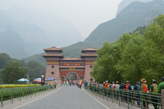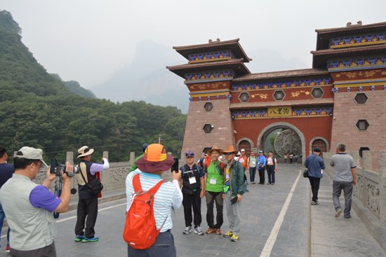 這個(gè)大型韓團(tuán)的游客剛到八里溝山門,就對(duì)古色古香的漢唐風(fēng)格門樓表示出極大的興趣,他們分批在山門前合影,錄像留念。