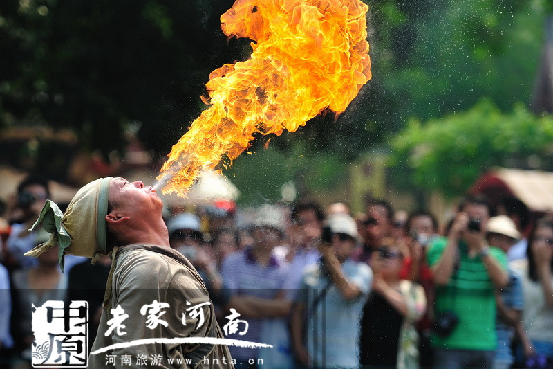 為慶祝端午節(jié)到來,西九華山風(fēng)景區(qū)請來了民間藝人為游客們表演噴火的絕活。據(jù)說這也叫氣功噴火,表演者先喝盡碗中的煤油,經(jīng)過運功練氣后,憑著體內(nèi)深厚的功力,扎穩(wěn)馬步,瞬時仰面,用力噴出六七米高的火龍,隨后把這長長的火龍再吸入丹田,然后發(fā)功通過丹田氣將汽油用嘴噴出,點燃成一條火龍……如此絕活定能讓眾游客大開眼界。另外還有多項豫南民俗雜技的表演展現(xiàn)給游客們。