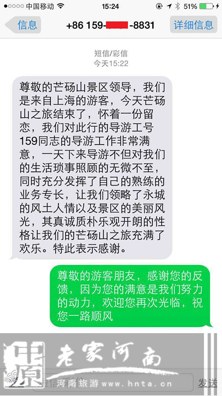 “尊敬的芒碭山景區(qū)領(lǐng)導(dǎo),我們是來自上海的游客,今天芒碭山之旅結(jié)束了,懷著一份留戀,我們對此行的導(dǎo)游工號159同志的導(dǎo)游工作非常滿意,一天下來導(dǎo)游不但對我們的生活瑣事照顧的無微不至,同時充分發(fā)揮了自己的熟練的業(yè)務(wù)專長,讓我們領(lǐng)略了永城的風(fēng)土人情以及景區(qū)的美麗風(fēng)光,其真誠質(zhì)樸樂觀開朗的性格讓我們的芒碭山之旅充滿了歡樂,特此表示感謝!”2015年7月8日,芒碭山漢文化景區(qū)質(zhì)檢辦負(fù)責(zé)人收到一條來自上海游客的短信,對芒碭山景區(qū)導(dǎo)游楊英的周到服務(wù)表示感謝。
