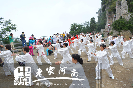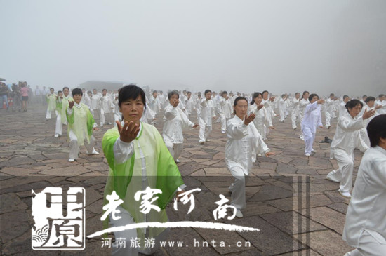 在“太極舞動天界山”大型展演開始前,恰逢霧鎖圣山,漫山云霧飄渺如同仙境。會集在天界山“清峰關(guān)”廣場上的500多名太極愛好者,隨著新鄉(xiāng)市政府副市長周世杰宣布開幕的號令,伴著太極舞音樂,太極拳舞動在飄渺云霧之中,境況虛無浮仙境,表演者神態(tài)自若,進入最佳境界。“清峰關(guān)”集體展演之后,又分別在“情侶石廣場”、“求官臺”、“老爺頂”和“歸真臺”四個景點進行了展演。