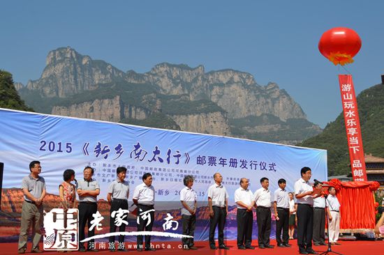 新鄉(xiāng)市政府副市長周世杰、陶鐵成,河南省郵政分公司、新鄉(xiāng)南太行旅游集團、新鄉(xiāng)市旅游局、輝縣市等單位的領(lǐng)導(dǎo)出席發(fā)行儀式。