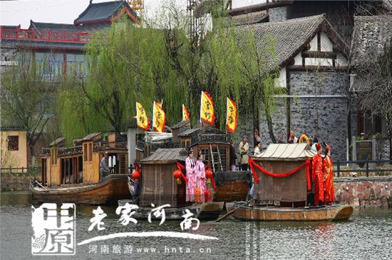 汴河里,在清明上河園浪漫的環(huán)境里,伴隨著朝陽升起,水波粼粼的汴河中緩緩駛來幾艘小船,敲鑼打鼓的迎親隊伍,那是誰家在娶媳婦兒嘍!