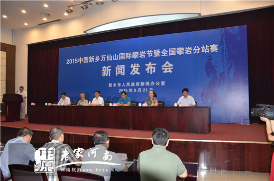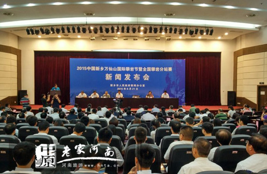 2015年中國新鄉(xiāng)萬仙山國際攀巖節(jié)暨全國攀巖分站賽(新鄉(xiāng)站)新聞發(fā)布會(huì)于8月21日上午9時(shí)在新鄉(xiāng)市政府綜合辦公樓一樓報(bào)告廳隆重舉行。新鄉(xiāng)市政府副市長周世杰及新鄉(xiāng)市體育局局長南果良、新鄉(xiāng)市旅游局局長劉英、輝縣市市長張星吉蒞臨本次發(fā)布會(huì)。同時(shí)新鄉(xiāng)南太行旅游有限公司總經(jīng)理王洪昌及全國30家新聞媒體記者共同出席發(fā)布會(huì)。