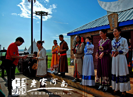 蒙古族自古以來就有各種迎賓禮節(jié),預(yù)約的會客,不論是社會團(tuán)體還是私人會面,主人總是遠(yuǎn)遠(yuǎn)的迎候著客人,而馬隊迎賓, 是蒙古族最高的迎賓儀式。