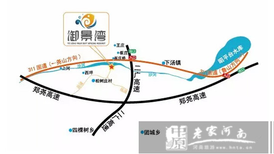 從鄭州至御景灣溫泉度假村:鄭州方向--鄭堯高速--下湯站出口--走下湯迎賓路上311國道--崔莊橋南100米即是。約80分鐘