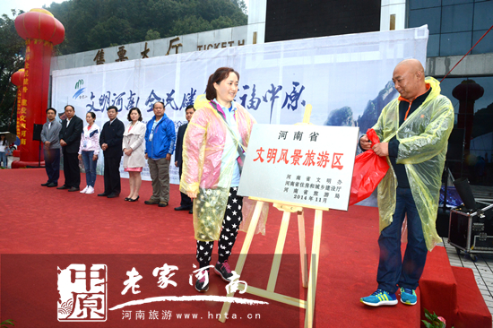 最后游客代表為洛陽白云山景區(qū)揭牌“河南省文明景區(qū)”,由河南省旅游局黨組織成員、紀檢組長周保建宣布2015年全國群眾登山健身大會暨河南省第五屆“三山同登”群眾登山健身大會洛陽白云山登山節(jié)開幕。