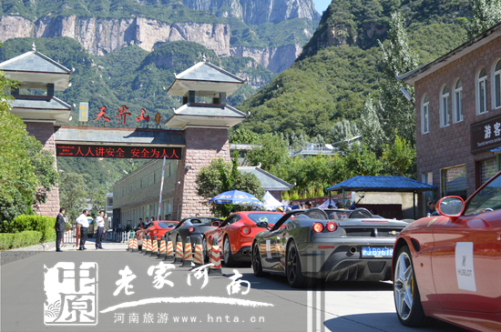 上午10時,20輛法拉利整齊有序地開進(jìn)天界山景區(qū),響應(yīng)《旅游休閑》雜志的口號“行走世界,享受生活”,駛進(jìn)太行之巔。