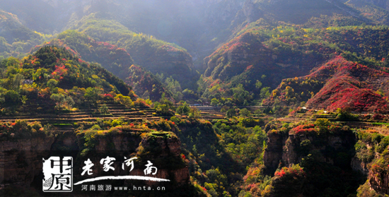 金秋時(shí)節(jié),林州太行大峽谷迎來(lái)了它一年中最絢麗多彩的季節(jié):紅葉漫山,果實(shí)累累,色彩斑斕,美景無(wú)限……。秋葉紅了,樹(shù)上的果子也熟了,山楂、柿子、蘋果,收獲的季節(jié)總是讓人心懷喜悅。路上、房頂上,到處晾曬著金黃的玉米、火紅的山楂。石街、石院、石墻、石柱、石梯、石樓與大自然渾然一體,到林州太行大峽谷,領(lǐng)略太行金秋的喜悅。