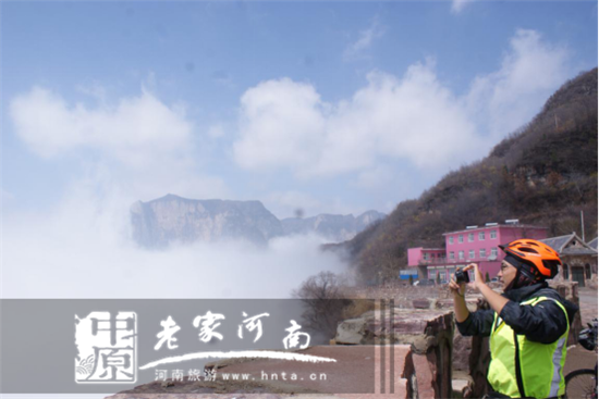 這位從四川省成都騎單車過來的游客,孤身一人,從天界山山門騎行9公里繞16座山峰的盤山道,到達“清峰關(guān)”,遇到了這難得一見的初冬云海。這是“老君”的安排,還是心誠的結(jié)果吶?