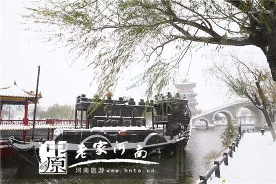 一場(chǎng)大雪紛飛,清明上河園白了屋頂、白了湖面、白了地,一不小心,便美成了天堂~