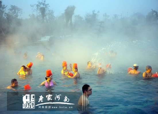 偌大的室外溫泉游泳池里熱鬧非凡,在勁爆的背景音樂中各種水上游戲正在火熱進(jìn)行,有水中拔河、水中排球、水中撕名牌等等,F(xiàn)場的歡呼聲在被激起的溫泉熱氣中一浪高過一浪,好玩程度堪比跑男。園區(qū)內(nèi)其他的40多個溫泉池內(nèi)也“座無虛席”擠滿的游客,在冒著熱氣的湯池中享受冬日里的溫暖。