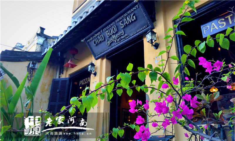 會安的家庭小旅館都很有特色,都是三四層樓高的樣子,門前有個小花園,擺著幾張桌子和椅子供游人發(fā)呆。外墻一律是彩色的,有藍有黃有綠,而且都種了好多花花草草的,看得出來,這里生活很休閑。
