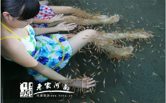 溫泉魚學(xué)名叫:吻魚,人們稱它為“親親魚.溫泉魚”;親親魚對人體無害,而且“親親魚”嘴里的分泌物可以起到殺菌消毒的作用,親親魚的吸吮可以刺激人體表皮神經(jīng),具有良好的健身作用,同時啄食人體老化皮質(zhì)、細菌和毛孔排泄物,進而排出體內(nèi)垃圾和毒素,人體能更好地吸收溫泉水中的多種礦物質(zhì),從而加速人體新陳代謝。