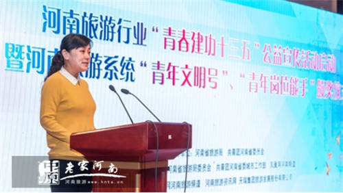 共青團(tuán)河南省委李山英副部長宣讀“博愛縣青天河風(fēng)景名勝區(qū)管理局導(dǎo)游班獲得“全國青年文明號(hào)”榮譽(yù)稱號(hào)。