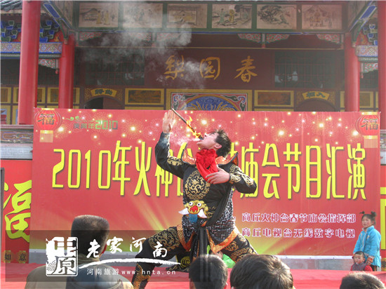 每年的古廟會上,各地的地方戲、曲藝、雜技、魔術(shù)及高蹺、鬼會、竹馬、旱船、肘歌、花棍、獨(dú)桿轎、拉秦檜、武術(shù)、龍燈等等各種民間藝術(shù)表演豐富多彩,令人目不暇接。舞火龍、;皙{、跳火圈、吞火吐火、取火種、續(xù)香火、燒雞蛋、烤食品、祭火神、祀火星、放煙火、賽花燈、玩鐵花、賽火把等民俗活動,是商丘及周邊地區(qū)的民眾崇火、敬火、愛火、祭火的火文化習(xí)俗的展現(xiàn)。