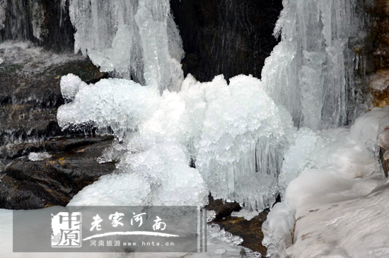 要說八里溝的美,首數(shù)八里溝的水。在寒冷的冬季,新鄉(xiāng)南太行八里溝景區(qū)的瀑布流水幻變成白色的冰晶和冰掛,她們美艷的藏在深山之中,等待著人們?nèi)バ蕾p。