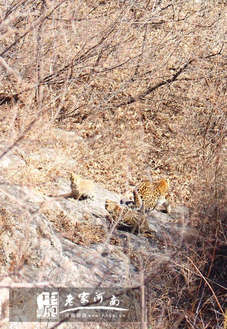 2月16日,開車經由修陵公路的千先生在云臺山景區(qū)茱萸峰14號洞附近的山上發(fā)現了一大兩小三只金錢豹,千先生隨即下車拍下了這難得一見的一幕。隨后,千先生致電云臺山景區(qū),反映了這一情況并向景區(qū)提供了他所拍攝的圖片,圖片上可以清楚地看到一只體格健壯的金錢豹和兩只幼豹。