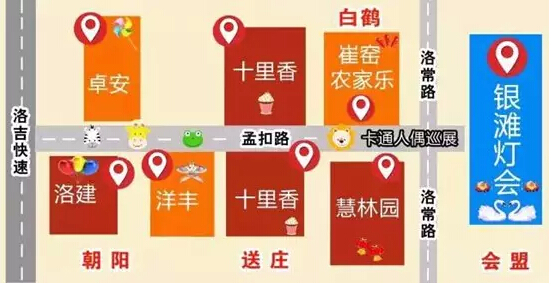2. 如果您從定鼎路出發(fā),向前入洛吉快速通道,再轉(zhuǎn)孟扣路休閑農(nóng)業(yè)觀光大道。從東花壇出發(fā),可沿洛常路行至?xí)随?zhèn),轉(zhuǎn)孟扣路向西,依次到慧林源、崔窯農(nóng)家樂(lè)一條街、十里香草莓基地、洋豐生態(tài)園、卓安農(nóng)場(chǎng)、洛建農(nóng)業(yè)觀光園。最后前往“十里銀灘黃河燈會(huì)”,因?yàn)榘碇烈估锏臒艄庑Ч蠲利悺?