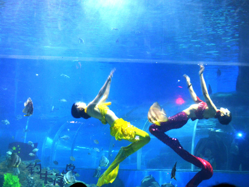 海底隧道全長150米,里面布滿了色彩斑斕的珊瑚礁和逼真造景,護士鯊、豹紋鯊、大海龜、黑鰩、七彩吊、大帆吊、刺尾藍吊等數(shù)千種珍稀海洋生物觸手可及。每天會準時上演夢幻“美人魚”,令您感受水下唯美的夢幻演出。每天不僅有三場美人魚表演還有三場海豚海獅表演以及白鯨表演。