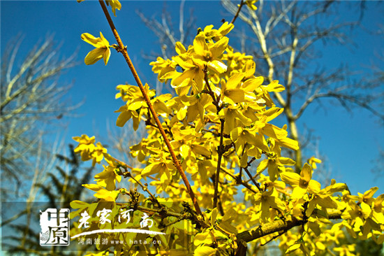 一蓬蓬連翹迎著春風(fēng)搖曳著細(xì)長的身姿,將整座山染成金黃。吸引著鳥兒,也吸引著游人,更是受到攝影者的親睞。