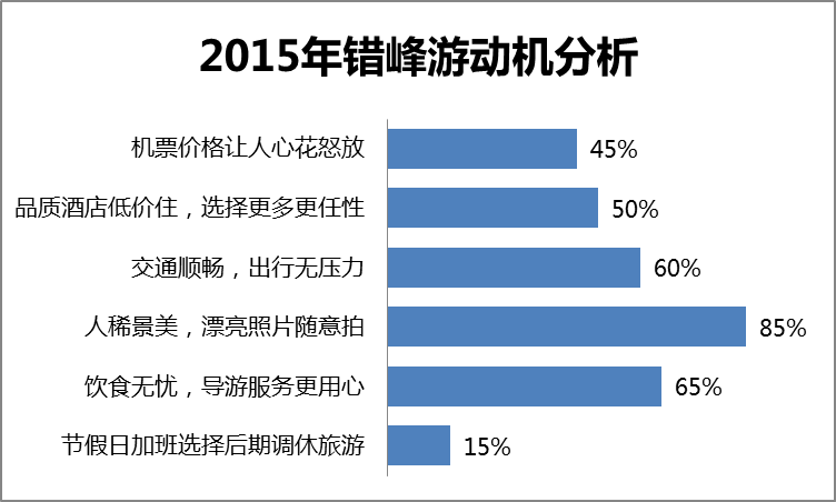 游客為何選擇錯峰游?途牛旅游網調研數據顯示,45%的游客認為“節(jié)后出游,機票價格讓人心花怒放”;50%的游客喜歡“品質酒店低價住,選擇更多更任性”;“交通順暢,出行無壓力”這一理由獲得了60%游客的青睞;85%的游客更愛“人稀景美,漂亮照片隨意拍”;65%的游客選擇“飲食無憂,導游服務更用心”;另外,因節(jié)假日加班而選擇后期調休錯峰游的游客占比達到15%。從游客選擇的理由可以看出,出游價格和出游品質是他們進行錯峰游最主要的考量,尤其以出游質量為重。