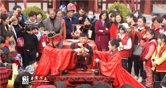 下午3點(diǎn),游客們?cè)趯?dǎo)游的帶領(lǐng)下來到芒碭山漢禮儀文化傳媒公司,觀看被譽(yù)為中國舞蹈“活化石”的儺舞演出,部分游客參與了漢婚禮體驗(yàn),體會(huì)結(jié)發(fā)夫妻的含義。