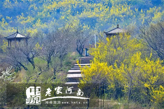 高山草甸野花成海,金黃的連翹、潔白的棠梨花、粉紅的桃花開得醉人。整個(gè)花海綿延數(shù)里。微風(fēng)吹來,花海如繽紛的浪潮,穿行其中,如漫步于花中仙境。