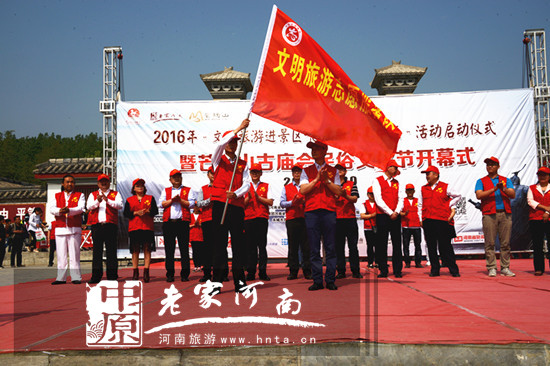 省旅游局文明辦副調(diào)研員張宏偉向景區(qū)“文明旅游志愿服務(wù)隊(duì)”授旗