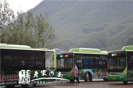 6月10日,端午節(jié)假期進(jìn)入第二天。下午6點(diǎn)多,一場陣雨突然降臨新鄉(xiāng)八里溝。在八里溝山門換乘站,三輛大巴車建起避雨“長廊”,一名調(diào)度員披著雨衣獨(dú)立在車外,等候游客。