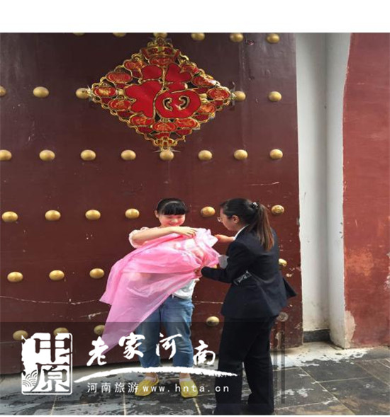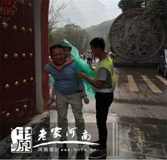 八里溝景區(qū)工作人員將雨衣蓋在女游客懷抱的孩子身上.....