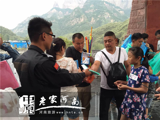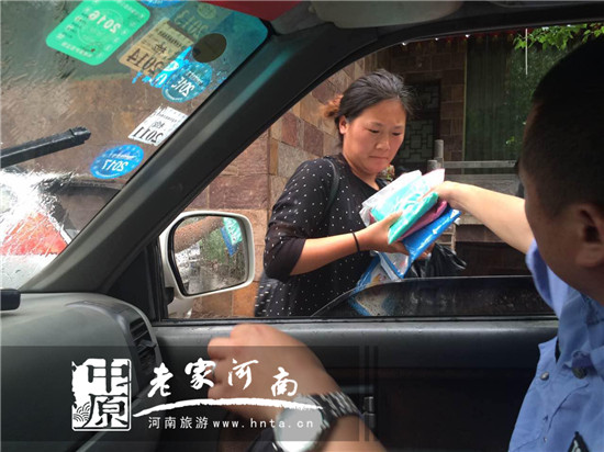 八里溝安保部副主管王佳磊開車在景區(qū)公路上為沒有雨具的游客,免費(fèi)發(fā)放一次性雨衣。