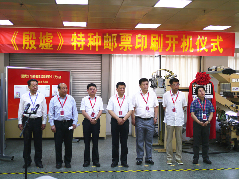 2016年6月18日,河南郵電印刷廠印刷車間內(nèi),中國(guó)郵政集團(tuán)公司郵票發(fā)行部、中國(guó)郵政集團(tuán)公司河南省分公司、安陽(yáng)市人民政府共同舉辦了《殷墟》特種郵票印刷開(kāi)機(jī)儀式。河南省政協(xié)副主席靳綏東,中國(guó)郵政集團(tuán)公司郵票發(fā)行部總經(jīng)理高山,郵票發(fā)行資深專家、原中國(guó)郵政集團(tuán)公司工會(huì)常務(wù)副主席劉建輝,中共安陽(yáng)市委常委、常務(wù)副市長(zhǎng)陳志偉,著名郵票設(shè)計(jì)家、該套郵票設(shè)計(jì)者王虎鳴等嘉賓參加儀式。著名主持人陳鐸主持。儀式現(xiàn)場(chǎng)對(duì)郵票樣張進(jìn)行簽字確認(rèn),并啟動(dòng)印刷機(jī)。